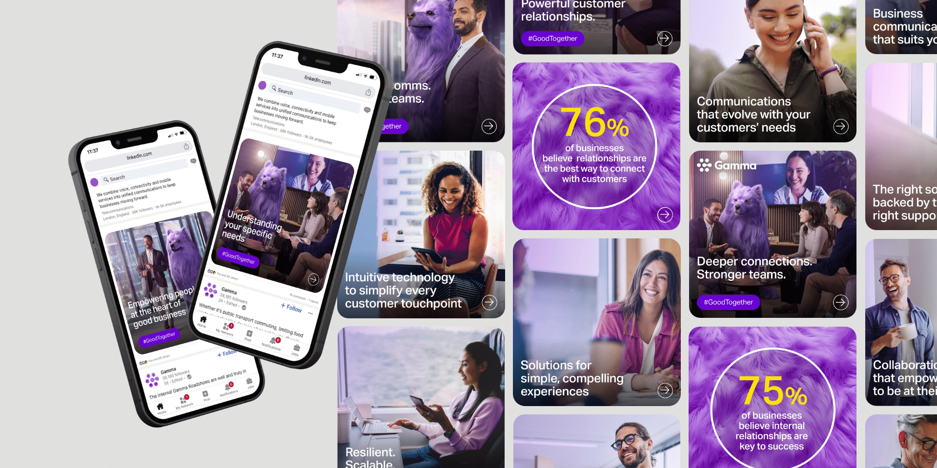 In a two-pronged approach, we first created the perfect visual metaphor for communicating Gamma’s values and positioning in a giant, fluffy, purple dog – your best friend and loyal partner through every up and down of business. Partnering with a 3D animation studio, we created a brand icon that could encapsulate the heart and soul of the Gamma offering, bringing the dog to life in a video and photography shoot, then unleashing it across digital, DOOH, social and online.